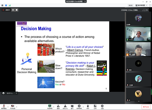 11月29日下午,应我校科技处、中原彼得堡航空学院的邀请,英国曼彻斯特大学陈玉旺教授在线上为我校师生做了题为“基于知识和数据的决策建模与分析”的专题学术讲座。讲座由中原彼得堡航空学院副院长王海泉主持,我校航空学院、电子信息学院、软件学院等院系相关专业的教师、研究生和本科生近100人参加。